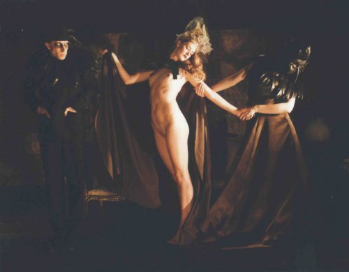 Marco Sanges cordially invites you to enter into his extraordinary worlds. This fantastic storyteller creates his photographic narratives as cinematic sequences, and as we peer through his silvered lens, the distortion suggests that all is meaningless, nothing has purpose. Within such surreal walls, logical arguments fall into nonsense; eloquent speech collapses into gobbledegook and the inevitable outcome is silence. As a result, the subjects are trapped in cruelly endless mimes, menaced relentlessly by incomprehensible outside forces. Borrowing stylistically from the silent movies of the 1920s and 30s, Sanges’ players gesture helplessly from the other side of their screens. Aghast, afraid, astonished, their expressions are enormously exaggerated.